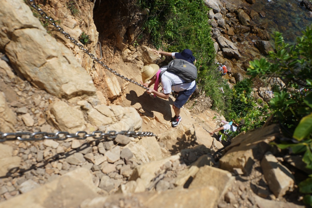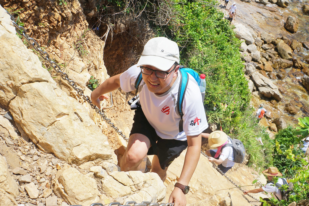 除了炎热的天气,迎接队友们的是更为危险和困难的挑战——接近90度达100多米的峭壁。大家拉着铁索,屏住呼吸小心翼翼地一步步向上攀登。