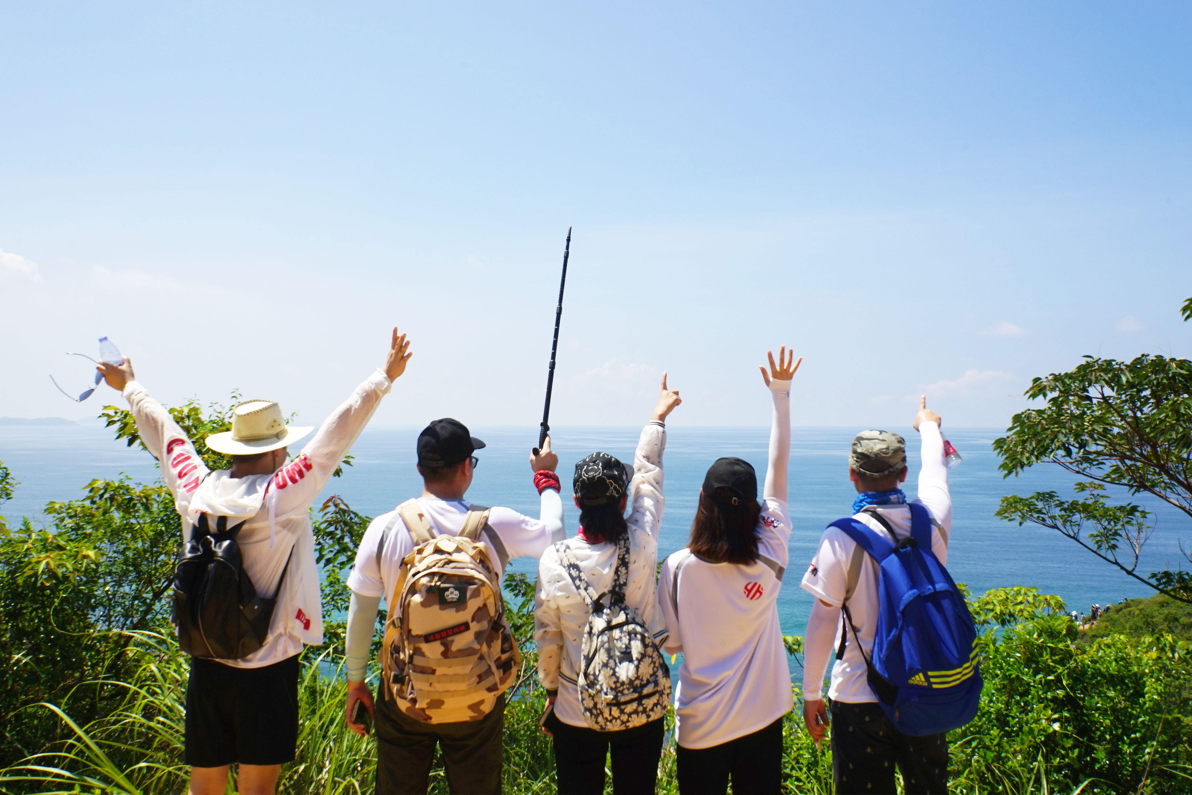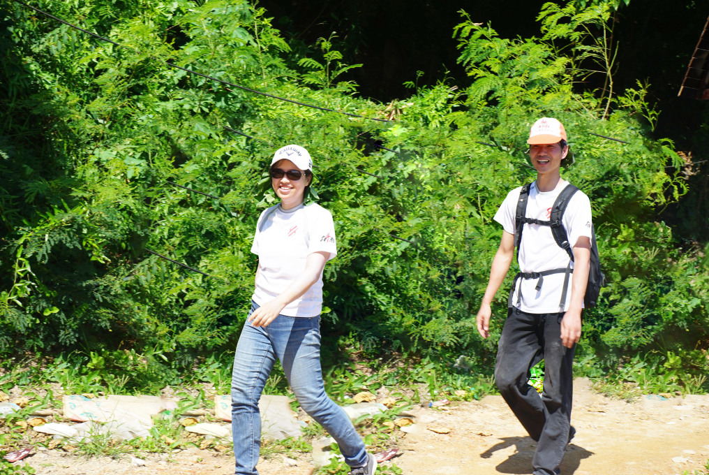 在每个危险的隘口和岩壁,给队友伸手拉一把;体力好一点的帮其他队友背背包。就这样,大家互相鼓励、互相帮助,5个小时内所有队员都到达了目的地,共同完成了这次的徒步任务!